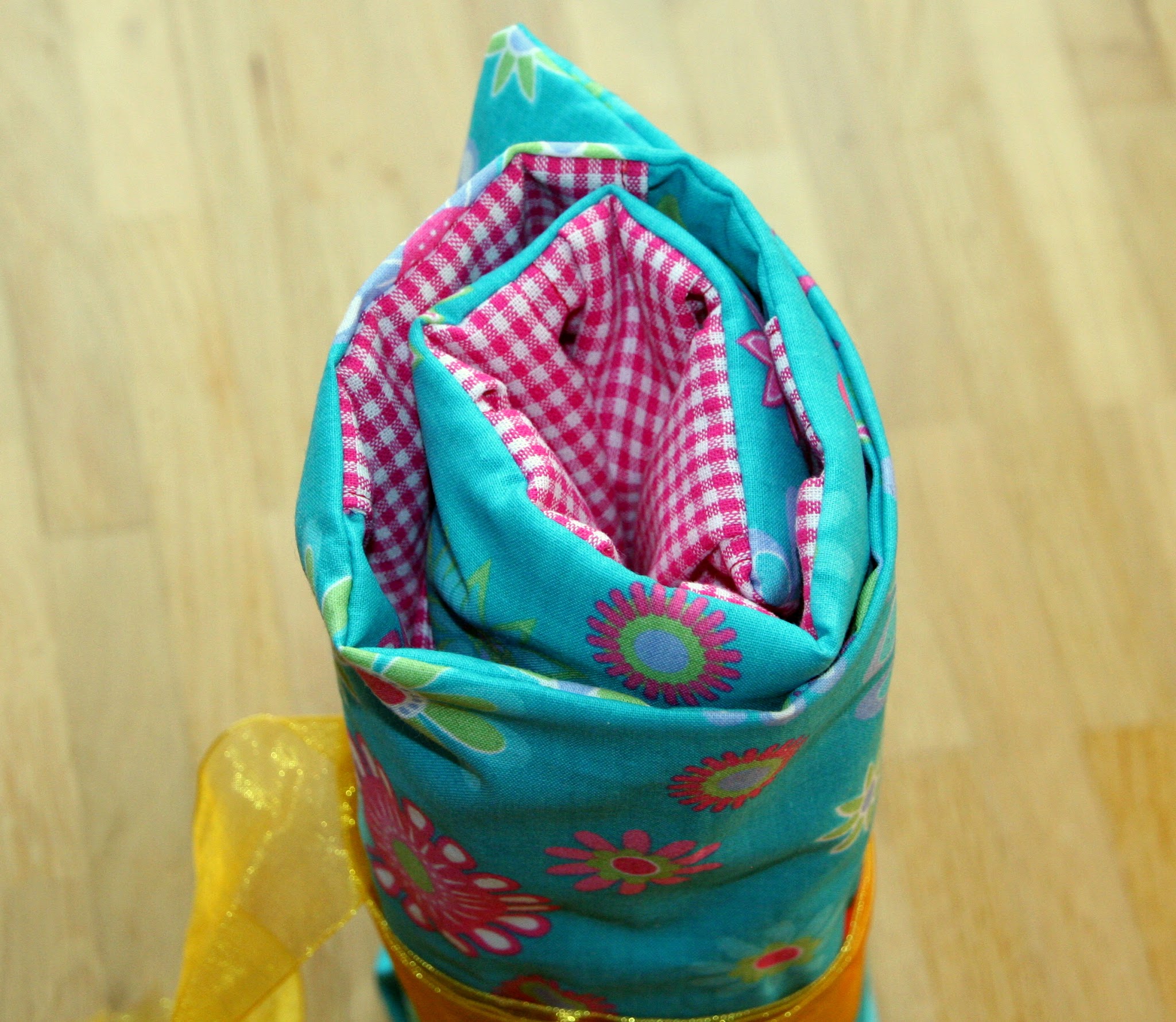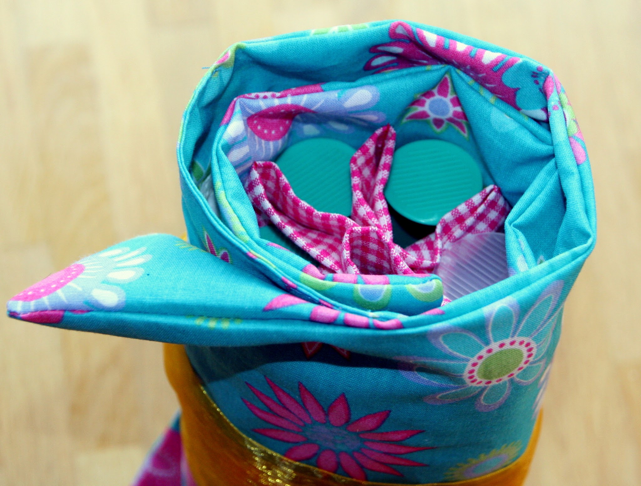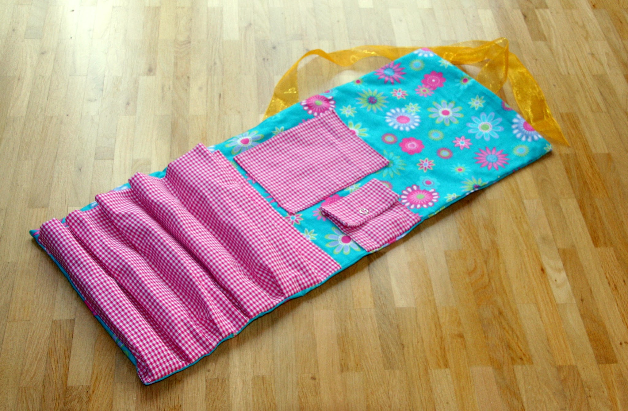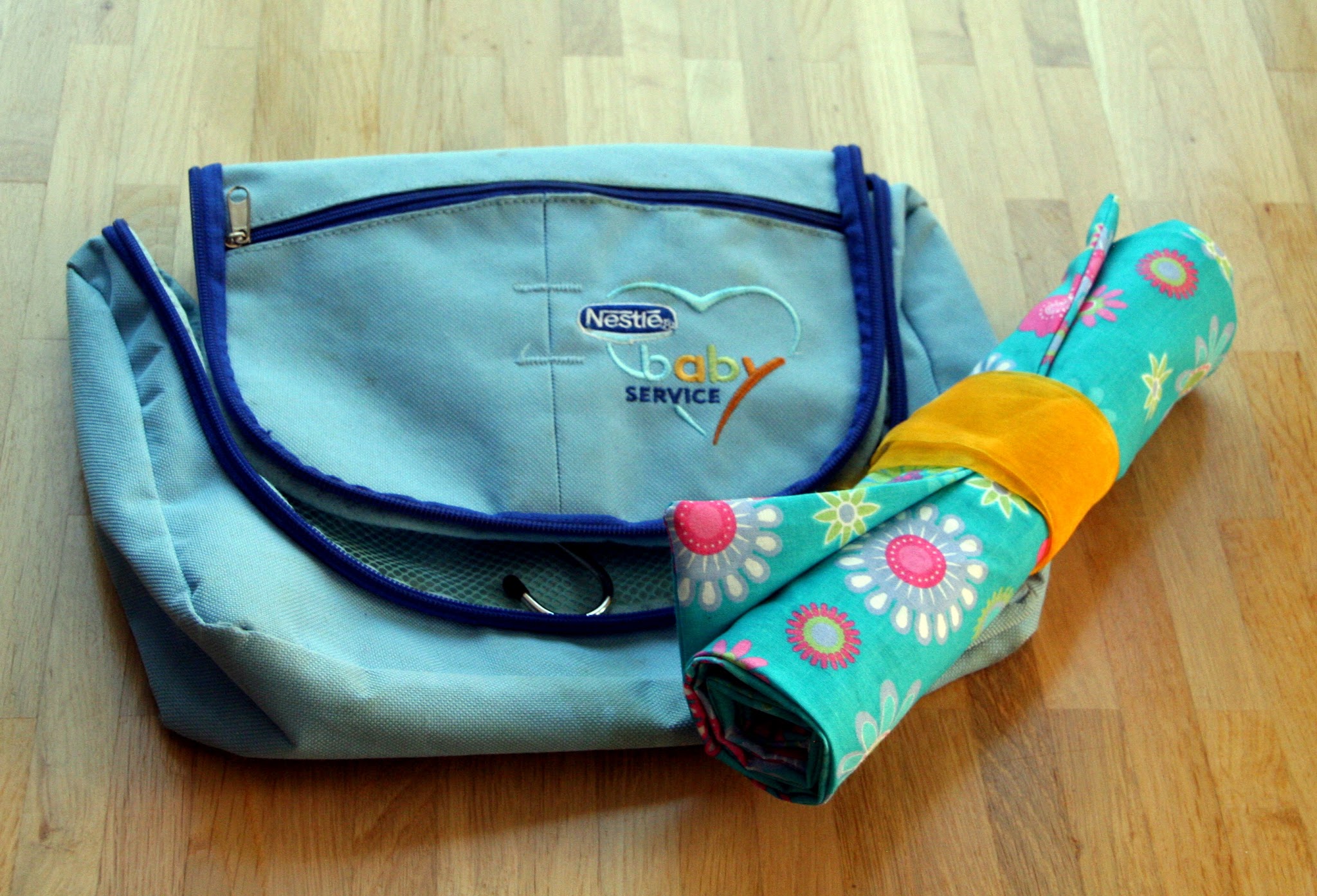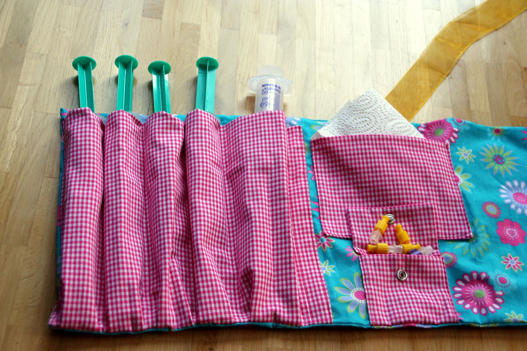 Wie man sieht, kann man alle Utensilien leicht entnehmen. Durch die eingearbeitete Falte an der Unterkante lassen sich die Spritzen ganz einfach nach oben drücken. Das Täschchen für die Küchentücher ist einfach oben offen, das Täschchen für die Adapter ist mit einem Druckknopf verschlossen, so dass da nichts rausfallen kann.
