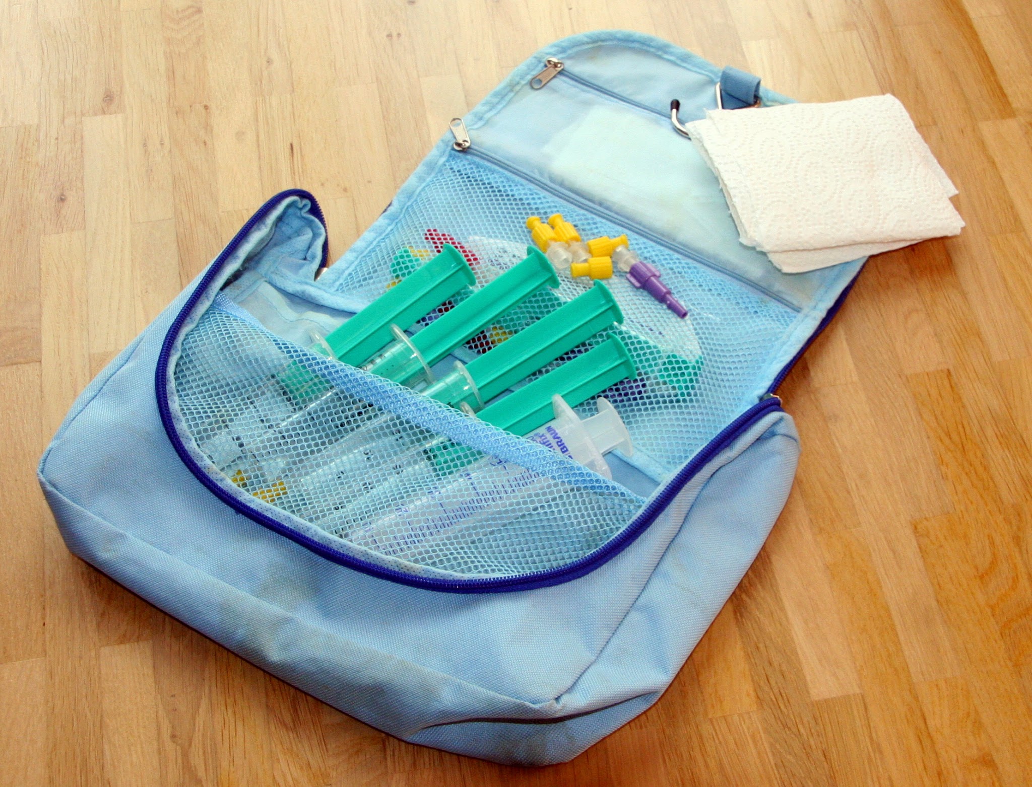 So sieht er ausgebreitet und befüllt aus, wobei man gar nicht sieht, wie er befüllt ist, denn alles verschwindet ganz ordentlich. Der MY Sprolli schafft es, bis zu vier gefüllte 20 ml Spritzen und eine 50 ml Sondierspritze aufzubewahren, außerdem Adapter und Zewa.