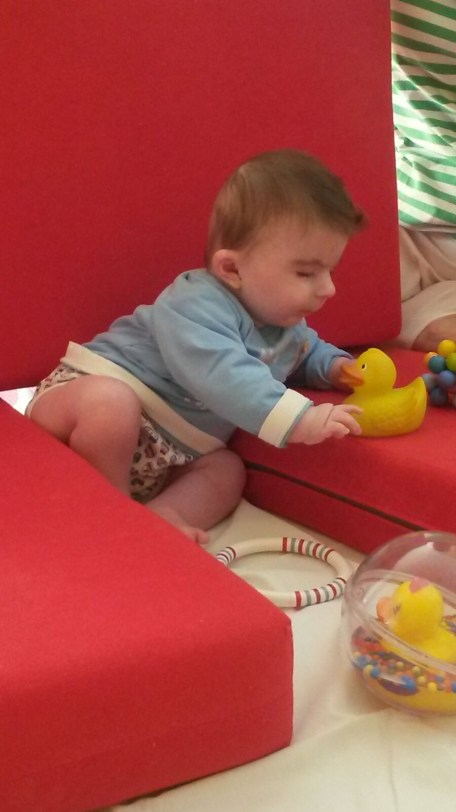 hinsetzen und legen, mit Porutschen und krabbeln bewegt er sich zurzeit am