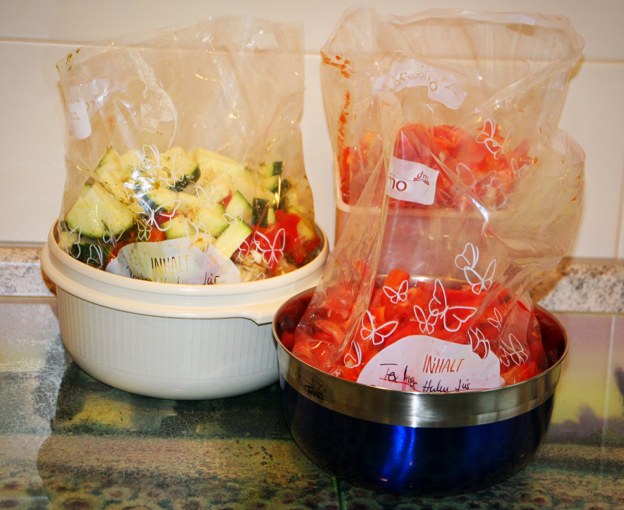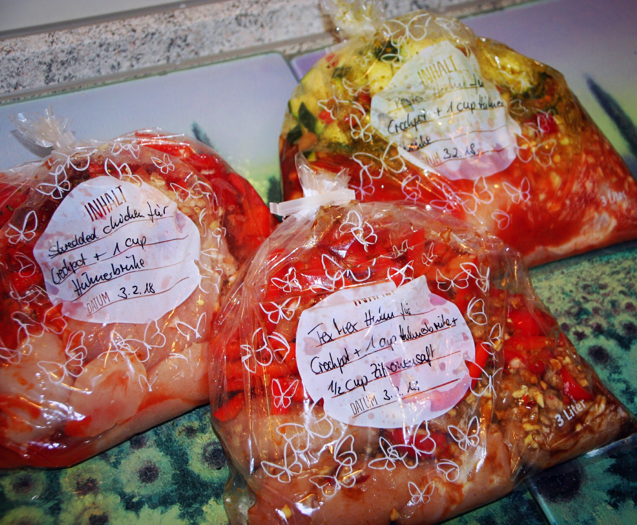 Wir haben einen Crockpot, den ich in einem früheren Post auch schon mal vorgestellt hatte (Slowcooker). Für genau dieses Küchenhelferlein wollte ich also drei Gerichte vorbereiten. In allen Gerichten ist Huhn, Paprika, Zwiebel und Knoblauch enthalten. Eine Variante kommt italienisch daher mit Pesto, die andere als Tex Mex, die dritte einfach als Huhn mit Paprika. Da ich alles einfrieren möchte, habe ich also Gefrierbeutel vorbereitet und schon mal beschriftet. Damit ich am Tag der Zubereitung nicht mehr nach dem Rezept suchen muss, vermerke ich mir gleich, was ich noch frisch zufügen muss – in jedem Fall Flüssigkeit, zum Beispiel Hühnerbrühe.