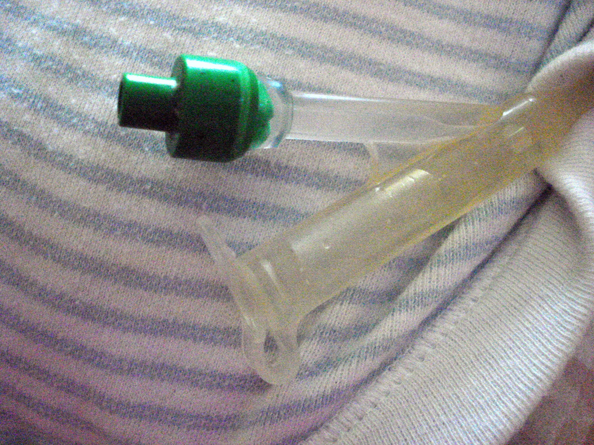 Stellen Sie sicher, dass der Ballon, der den Tube bzw. Button hält, noch dicht ist. Dazu verfahren Sie genaus so, wie wenn Sie die wöchentliche Kontrolle vornehmen. Entblocken und kontrollieren, wieviel Wasser aus dem Ballon heraus gezogen werden kann. Der grüne Anschluss ist in diesem Beispiel der Richtige für dieses Vorhaben – Klammer öffnen nicht vergessen!