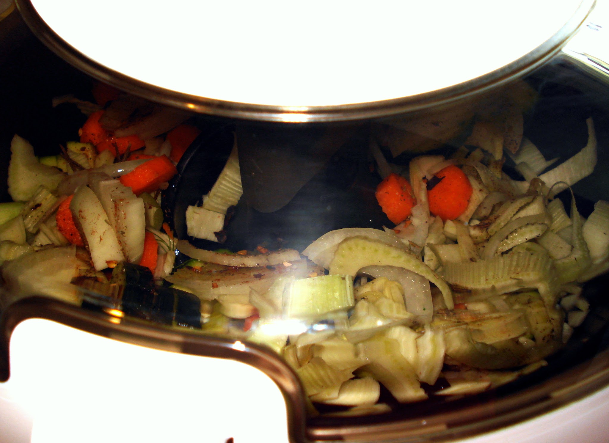 Es war noch ein wenig Gemüse übrig, aber wie so oft nicht grad viel Zeit. Was mach ich also auf die Schnelle aus einer Zucchini, einer Karotte und eineinhalb Fenchelknollen? Ganz einfach, ich schneide alles klein, füge eine Zwiebel hinzu, würze mit Salz, Pfeffer und ein wenig Paprika, gebe einen Löffel Öl dazu und dann ab in die Friteuse. Wie? Das finden Sie abwegig, wo ich doch versuche auf gesunde Mahlzeiten zu achten? Naja, keine normale Friteuse. Unsere sieht so aus: