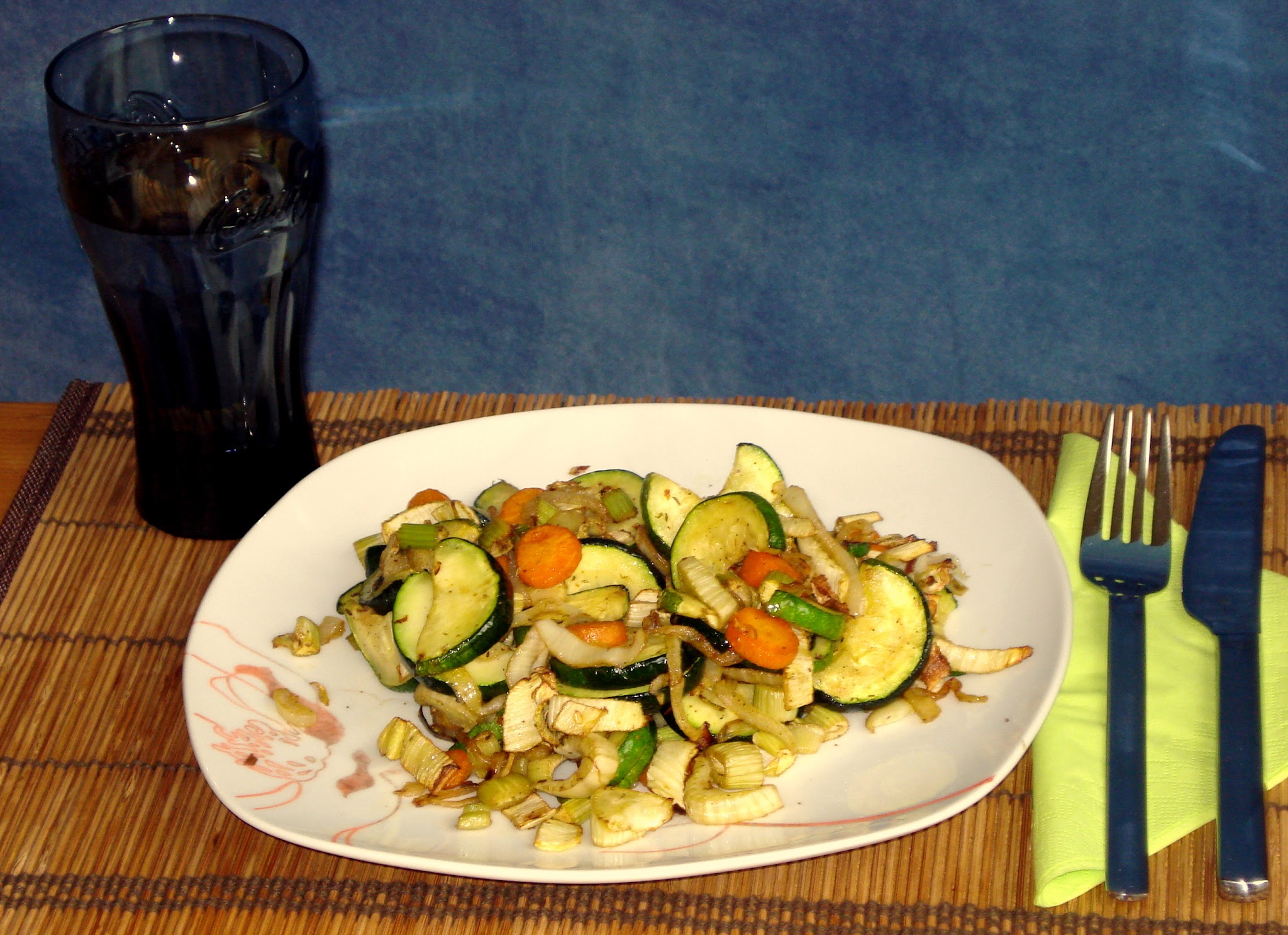 Nach etwa zwanzig Minuten hatte ich ohne dabeistehen zu müssen eine leckere Gemüsepfanne, die wirklich fettarm zubereitet war und unglaublich lecker geschmeckt hat. Wer mag kann einen Dip dazu essen und schon ist das Essen zubereitet.