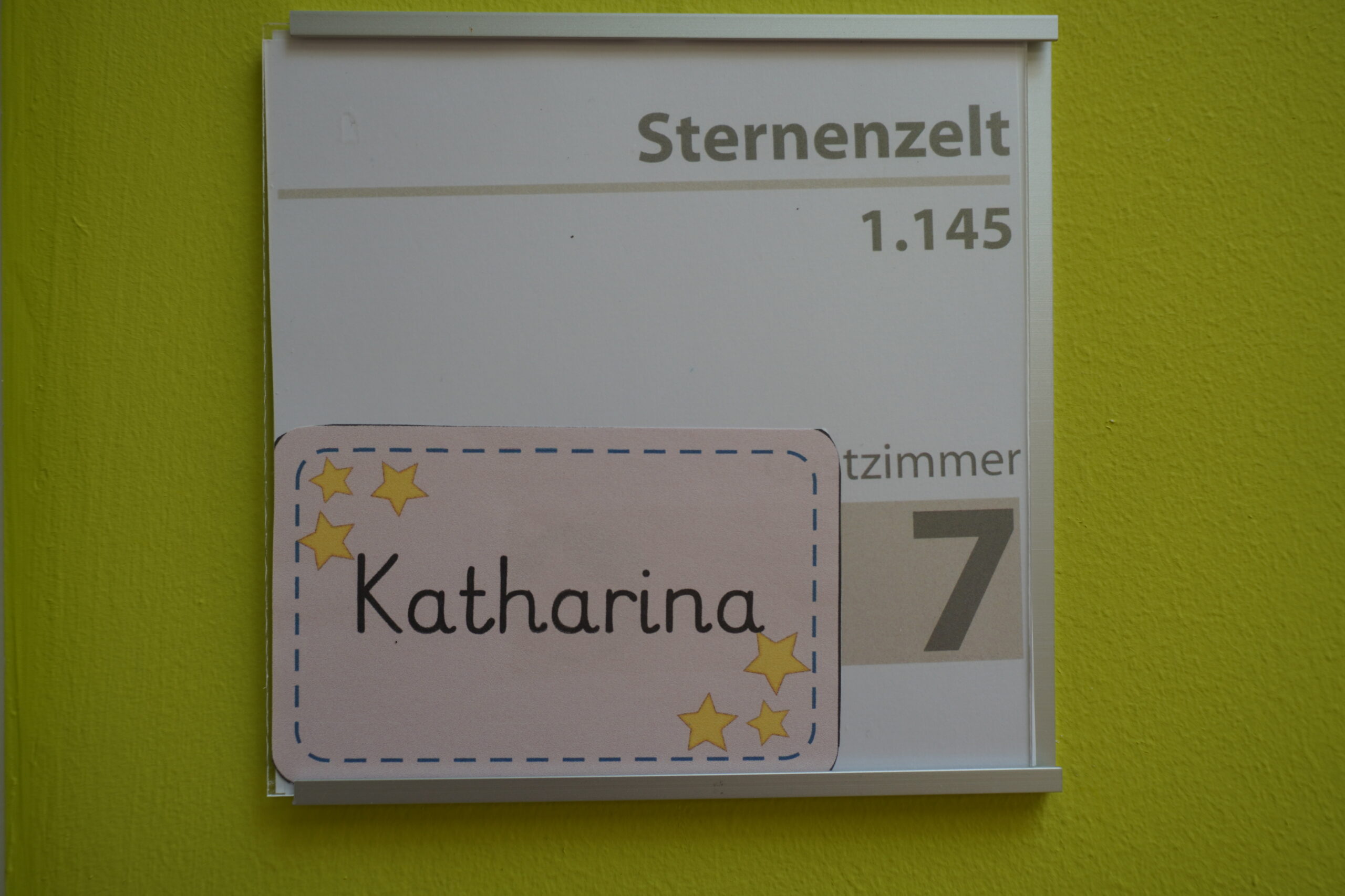 Das Haus hat Hanglage, der Eingang befindet sich also im 1. OG. Auf dieser Ebene befinden sich auch die Kinderzimmer, die mit verschiedenen Pflegebetten ausgestattet sind. Jedes Gastzimmer hat auch ein eigenes Bad. Neben der Zimmernummer wird liebevoll gestaltet der Name des Gastes gezeigt.