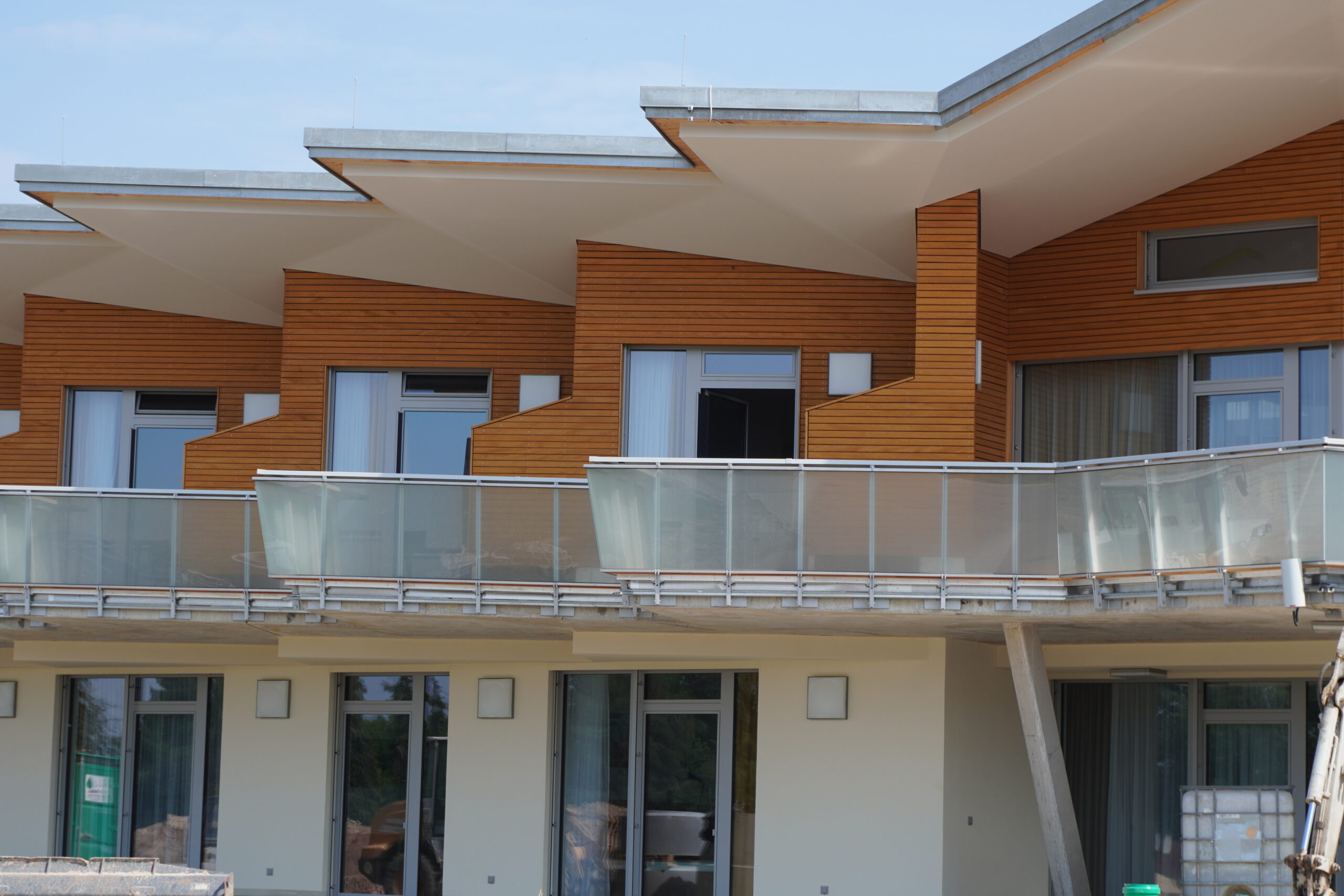 Im unteren Bereich des Hauses befinden sich die Elternzimmer, die zweckmäßig eingerichtet sind mit einem Doppelbett, einem Schreibtisch und einem ausziehbaren Sessel. Mit Sicherheit wird man es sich künftig auch auf den gerade entstehenden Terrassen gemütlich machen können. Dass diese großzügig angelegt sind, lässt sich bereits jetzt erahnen.
