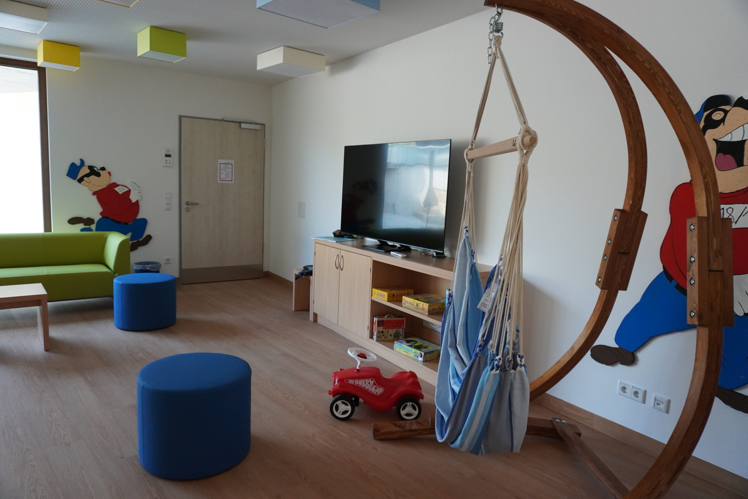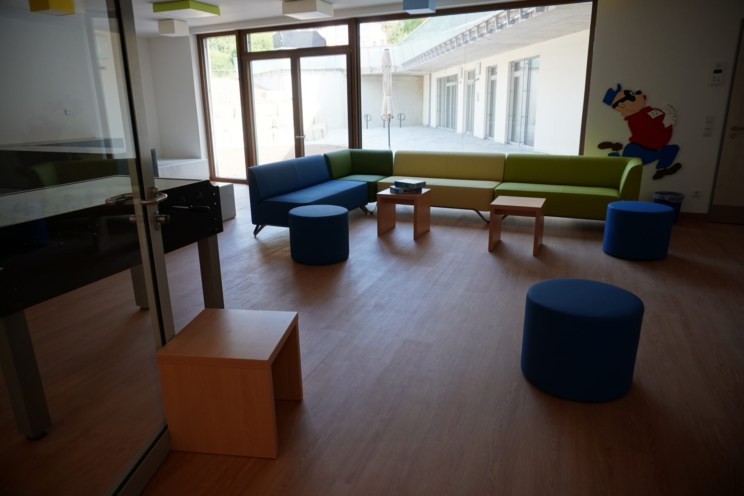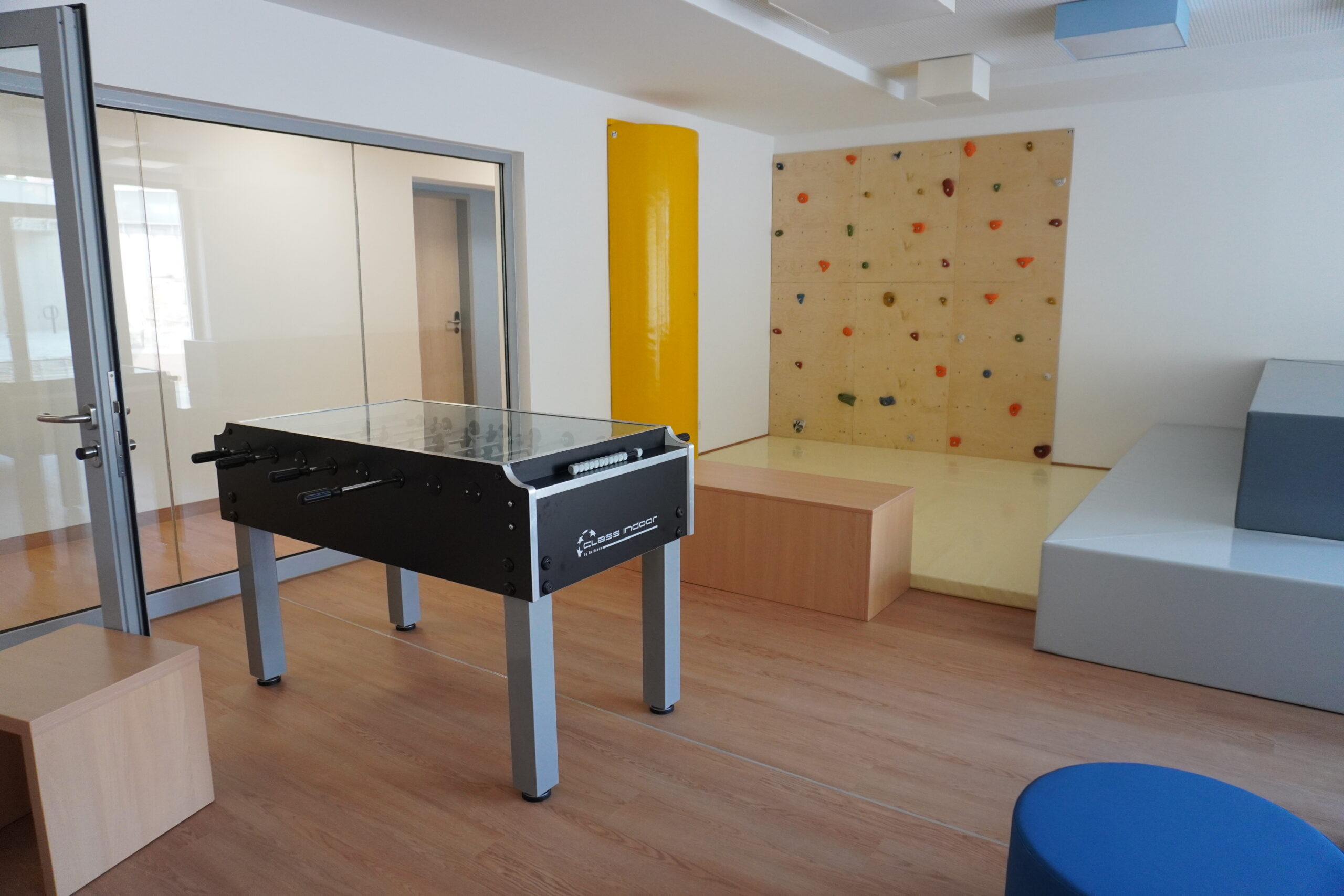 Oder aber im Youth-Room chillen. Dort findet sich neben einem Kicker auch eine Kletterwand, ein Riesen-Fernseher und genügend Platz zum toben und erholen. Der dazu gehörige Außenbereich lädt ebenfalls zum Aufenthalt und Spielen ein.