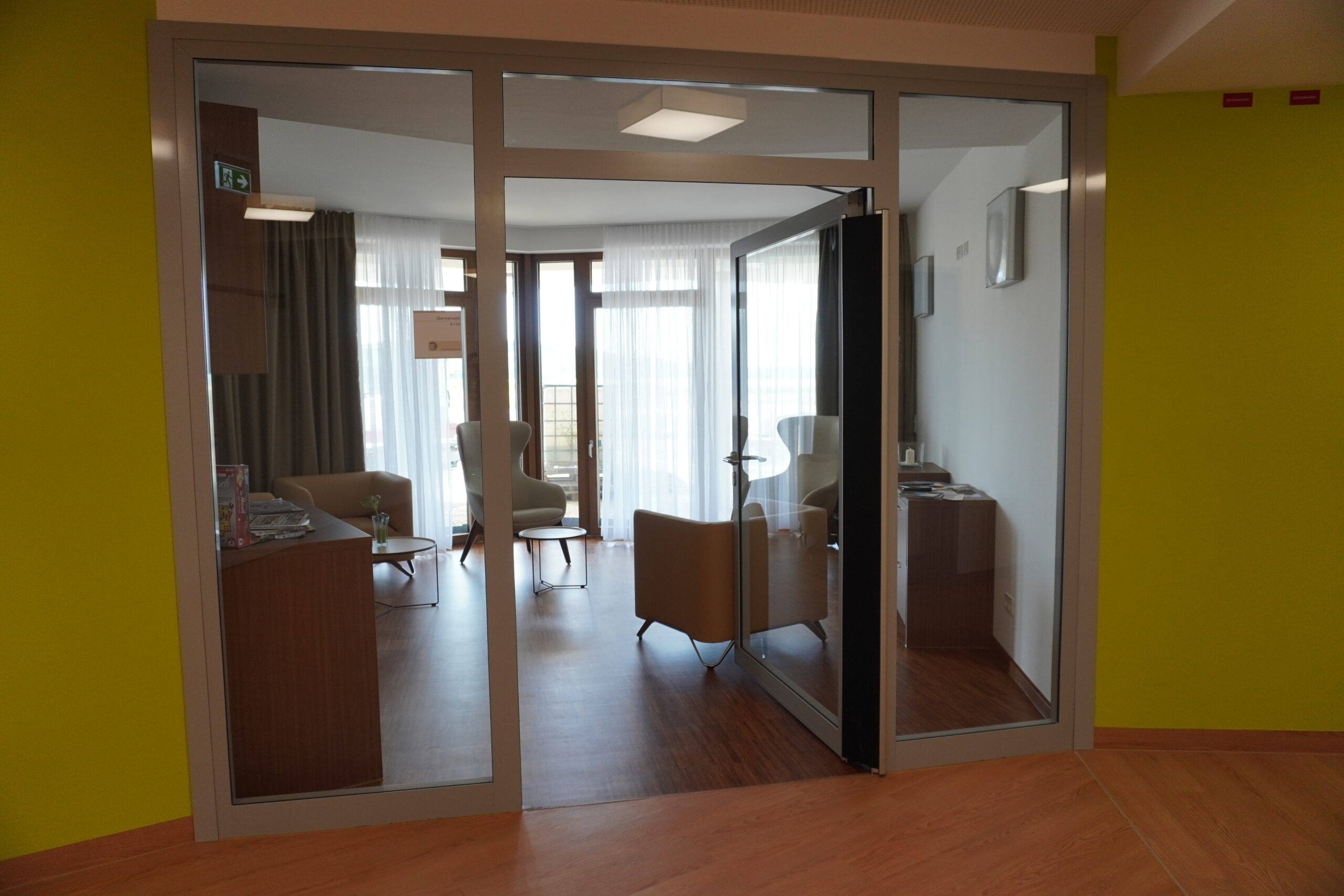 Das Haus hat Hanglage, der Eingang befindet sich also im 1. OG. Auf dieser Ebene befinden sich auch die Kinderzimmer, die mit verschiedenen Pflegebetten ausgestattet sind. Jedes Gastzimmer hat auch ein eigenes Bad. Neben der Zimmernummer wird liebevoll gestaltet der Name des Gastes gezeigt.