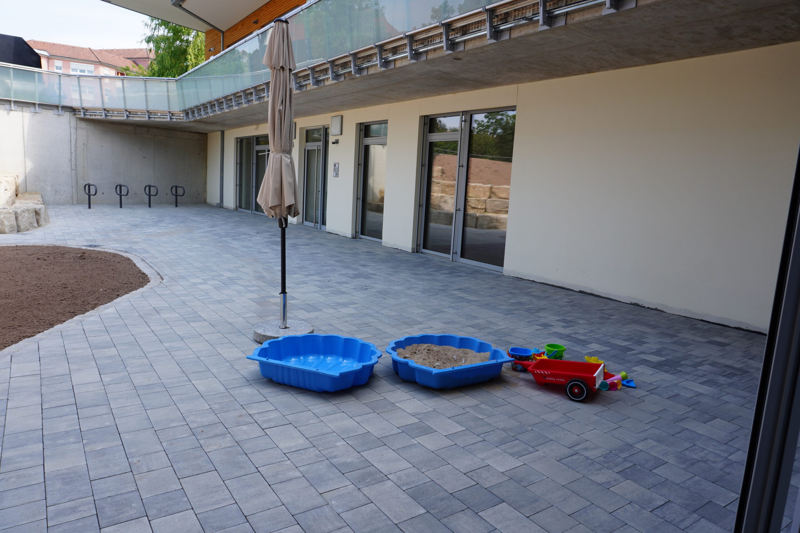 Um den gesamten ersten Stock führt ein Balkon, auf dem vor jedem Kinderzimmer ein schmaler Strandkorb steht. Vom Balkon aus hat man auch Sicht auf den nahen Bruderwald, der zu Spaziergängen oder Joggingrunden einlädt. Für Kinder sehr aufregend ist natürlich der Hubschrauberlandeplatz, der im Zuge der Neugestaltung der Außenanlagen allerdings auf das Dach des angrenzenden Klinikums verlegt wird.